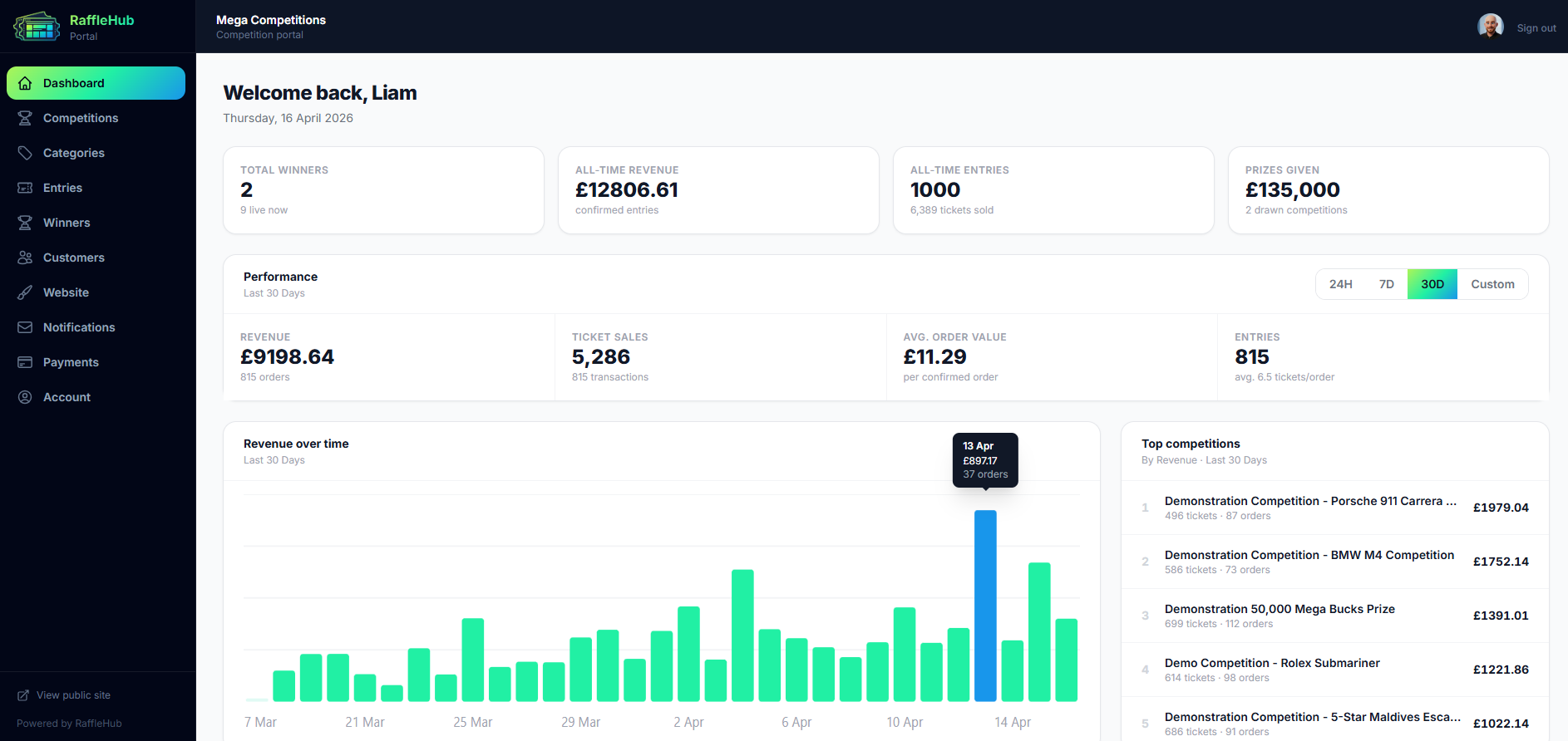 Manage competitions, track revenue analytics, monitor entries, handle customers, and configure settings - all in one place.